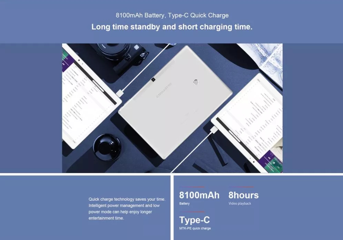 테클라스트 T20의 자랑입니다. 8100mAh라는 초대용량 배터리로 영상을 연속 8시간동안 볼 수 있습니다. 웹서핑과 함께하면 하루 종일 보아도 방전되지 않을 정도로 매우 큰 용량입니다. 게다가 타입C의 USB를 채용하여 더 빠른 전송속도와 충전속도를 지원합니다.