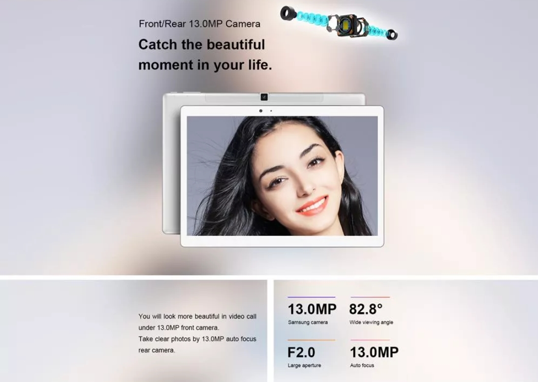 테클라스트 T20의 카메라는 전후면 1300만 화소이며 F2.0값의 밝은 조리개를 제공합니다.