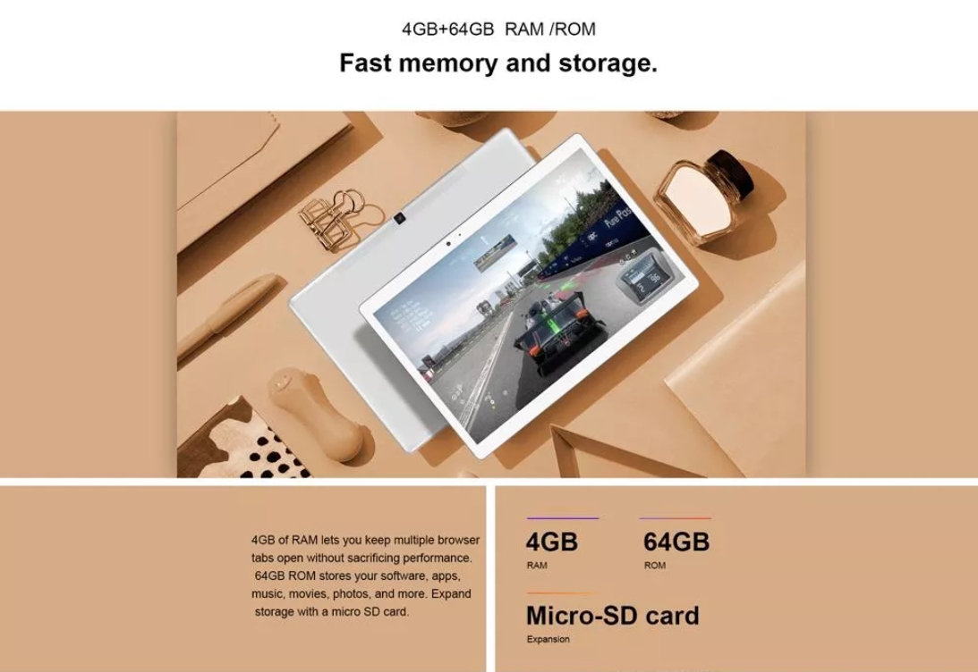 테클라스트 T20은 기본적으로 4GB RAM과 64GB의 저장공간을 자랑합니다. 겍다가 마이크로SD카드 슬롯이 있어서 최대 256GB 추가 확장이 가능한 강력한 태블릿입니다.