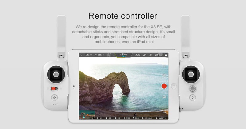 FIMI X8 SE의 원격 컨트롤러는 스마트폰과 아이패드 미니 크기의 태블릿까지 장착이 지원 됩니다.