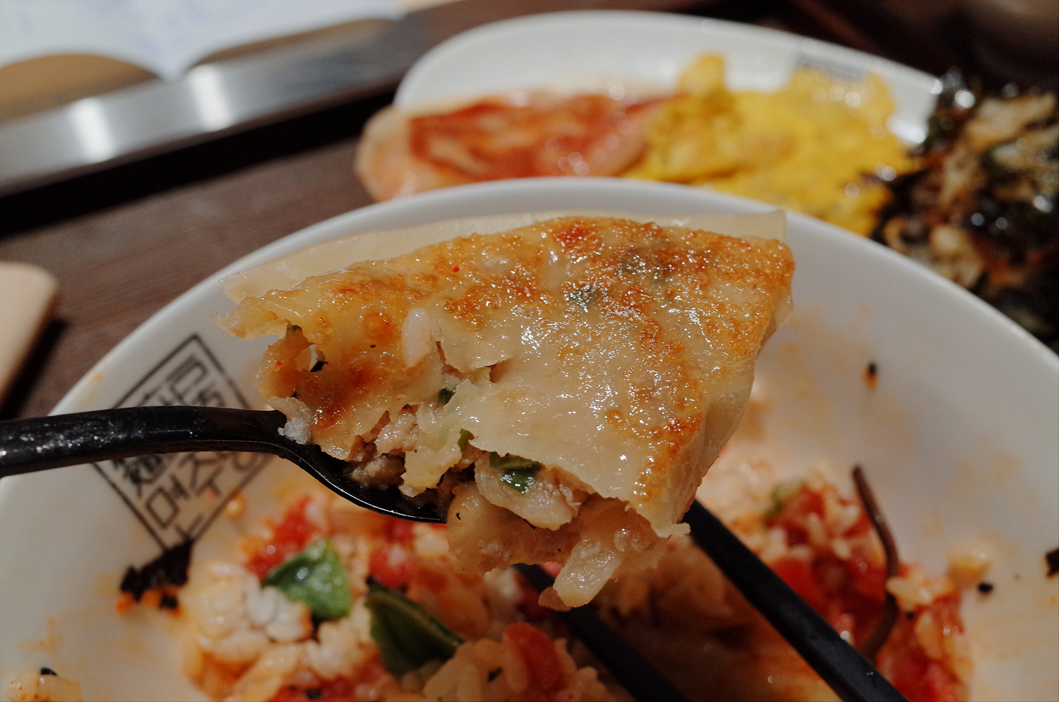 그리고 납작만두가 진짜~!!! 맛있었어요. 두개가 나오는데 하나는 김치만두, 나머지 하나는 고기만두입니다.