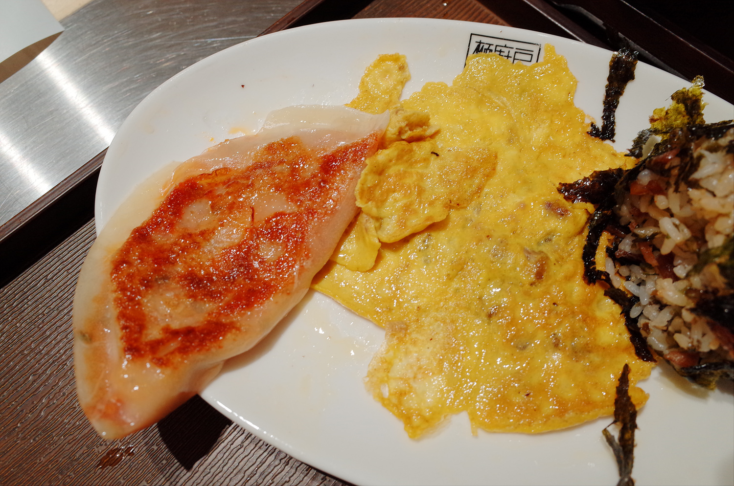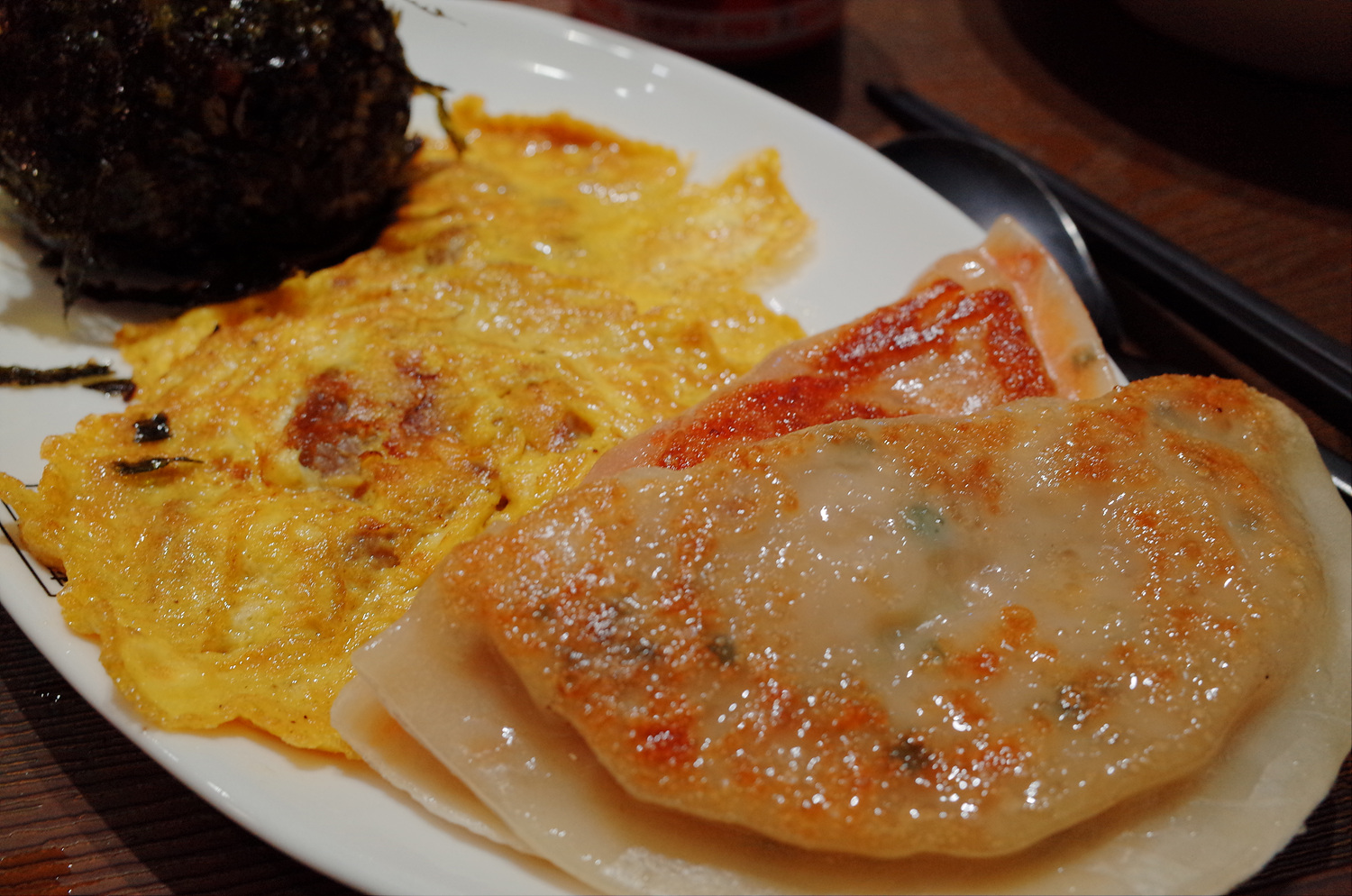 세트메뉴에 딸려오는 계란부침과 납작만두, 그리고 동그란 김주먹밥입니다.