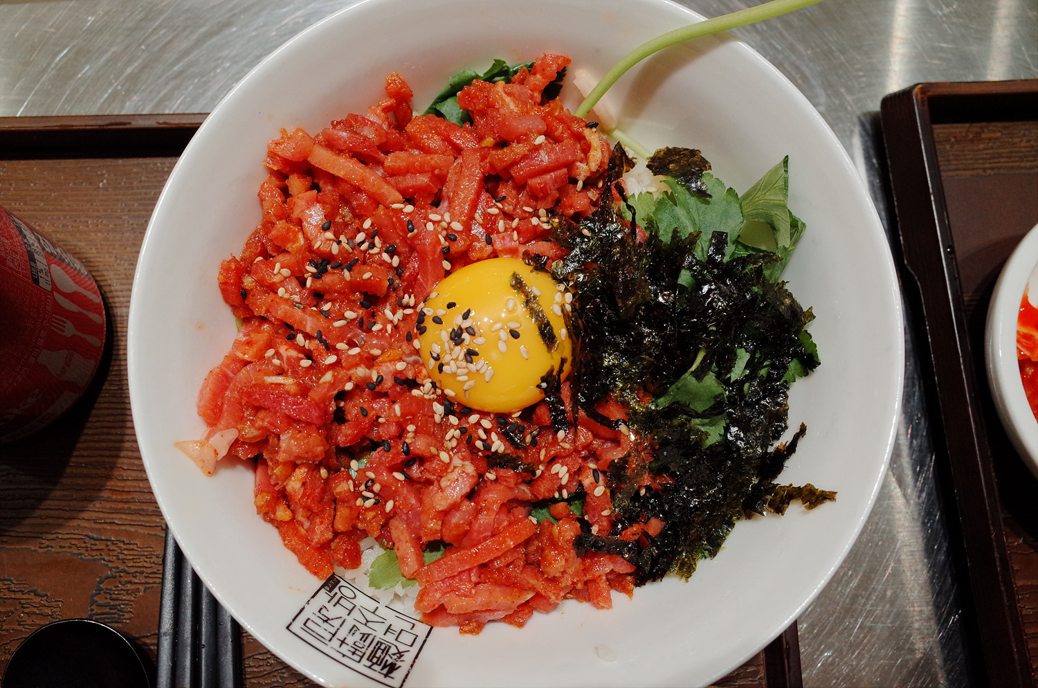 메뉴판에는 1인 시그니쳐 메뉴와 2인 세트 메뉴가 있습니다. 그리고 정갈한 국밥세트도 있네요. 저희는 2인세트에서 두번째 갈비국수와 통삼겹찜 덮밥을 먹기로 했으나 워낙 인기 품목이라 품절되어 2인 세트중 첫번째인 갈비국수 매운맛과 육회비빔밥을 먹기로 했습니다.