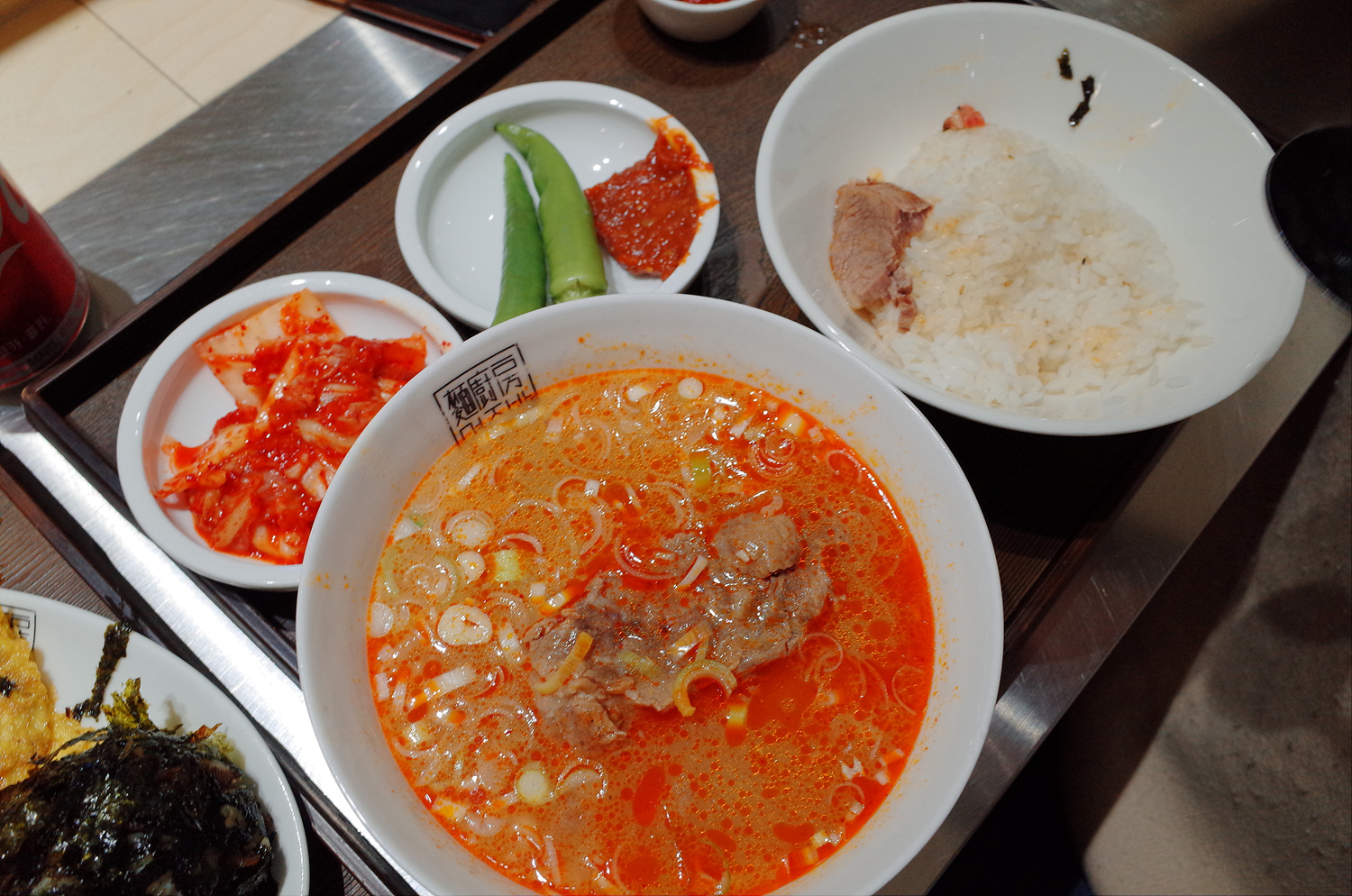 매운 갈비국수 구성입니다. 밥도 한공기 줍니다. 고추 진짜 맛있었어요.