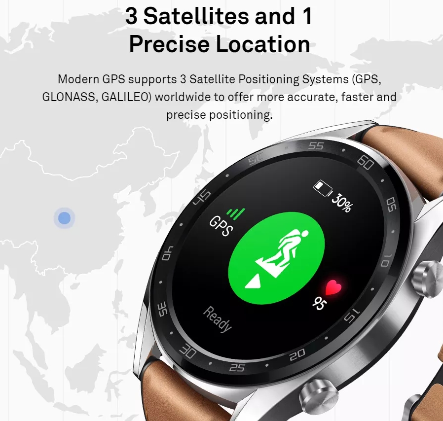 화웨이 GT 스포츠 스마트워치는 GPS, GLONASS, GALIEO의 3개의 위성 위치 측정 방식으로 더욱 정확한 위치를 잡아낼 수 있습니다.