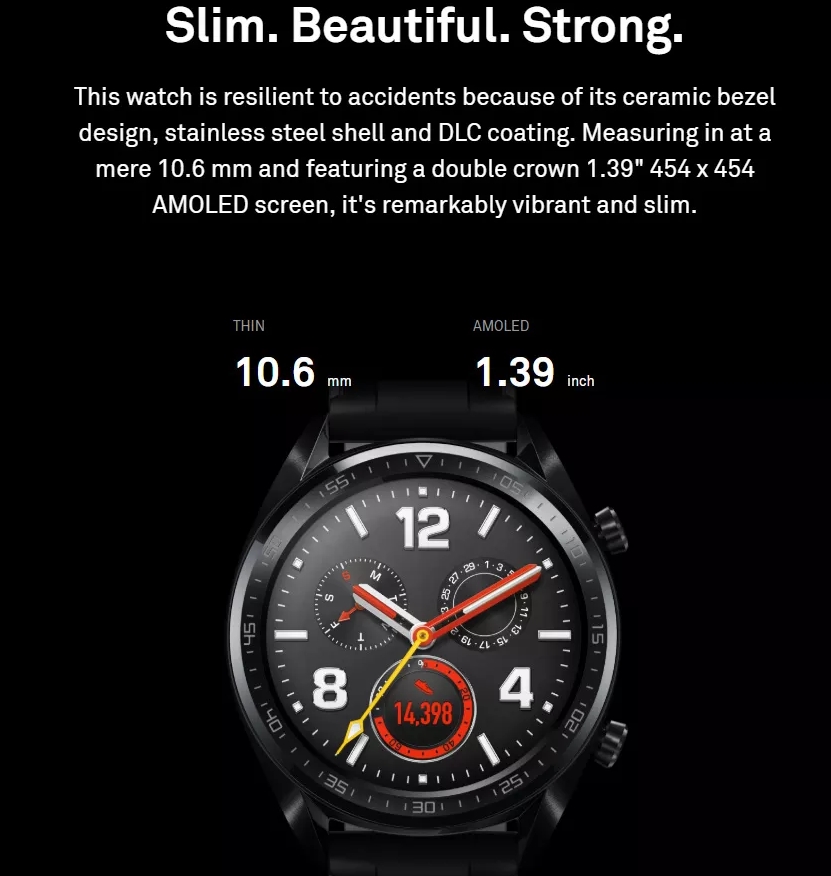 화웨이 GT 스포츠 스마트워치는 10.6mm의 두께로 메우 얇으며, 1.39인치의 아몰레드 원형 디스플레이를 가지고 있습니다.
