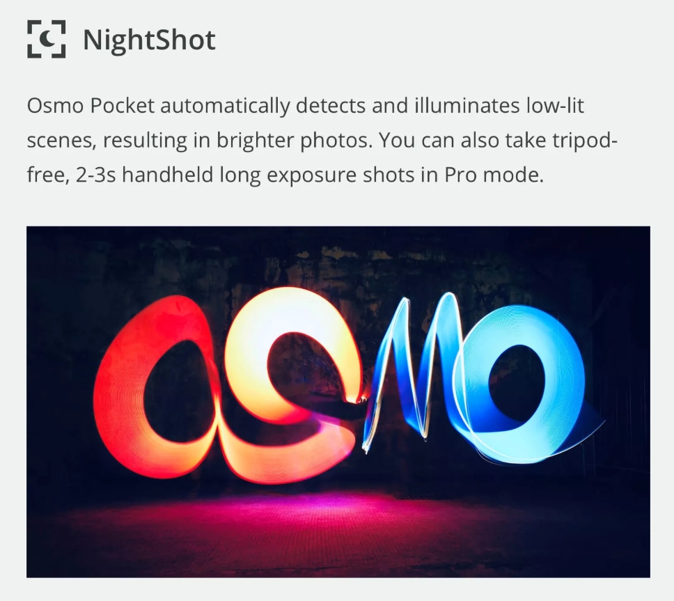 오스모 포켓은 야간 촬영 기능이 있으며, 기계식 손떨림 방지 기능이 있기 때문에 야간에도 선명한 사진을 남길 수 있습니다.