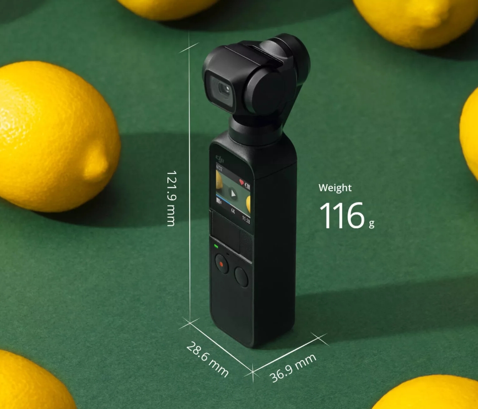 오스모 포켓은 116g의 매우 가벼운 무게에 손바닥 길이만한 12cm 길이로 4K 영상을 담아낼 수 있습니다.