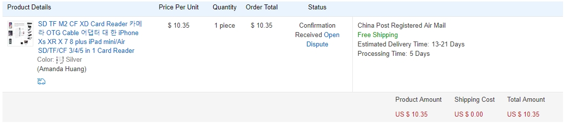 보통 아이폰용 OTG 허브를 국내 배송으로 사려면 4~5만원 정도 비용이 드는 것으로 알고있다. 게다가 내가 산 허브케이블은 마이크로SD와 일반 SD카드에 USB연결까지 가능한데, SD카드나 마이크로SD카드 슬롯이 없어도 4만원을 훌쩜 넘긴다. 그에 비해 알리익스프레스에서는 10.35달러. 우리나라 돈으로 약 12,000원 안쪽이다.