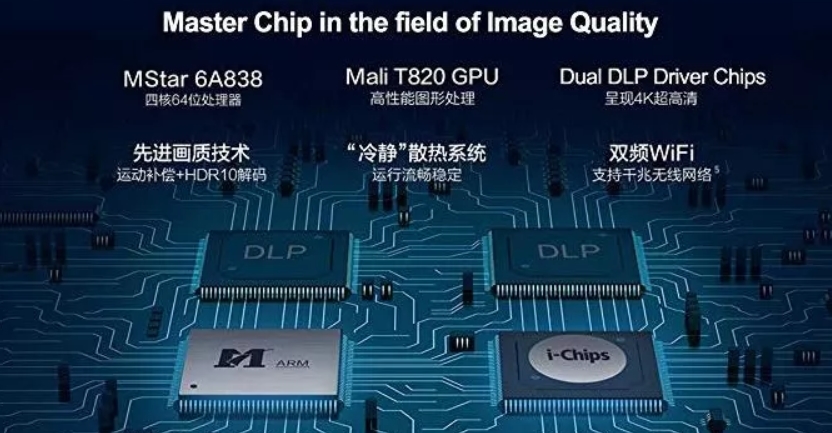 XGIMI Lune 초단초점 레이저 프로젝터의 메인포드 칩에는 MStar 6A838 CPU와 MaliT820 GPU, Dual DLP Driver칩이 장착되어 있습니다.