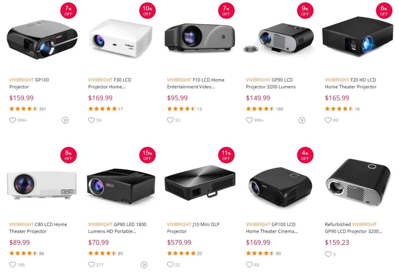 현재 세일중인 비비브라이트 제품들입니다. 적게는 10만원 이하에서 많게는 60만원대까지 있습니다. 유명한 VIVIBRIGHT F30, GP100, GP90, C80 제품은 베스트셀러라고 볼 수 있습니다.
