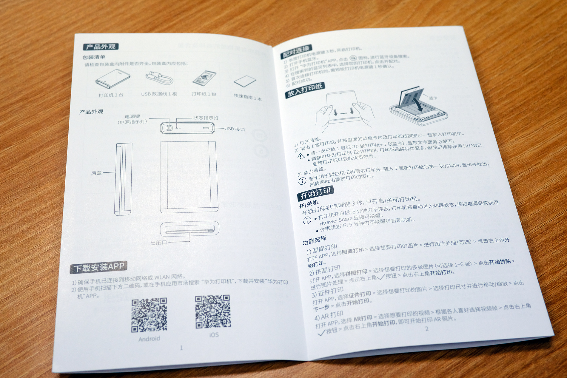 설명서에는 기본 구성및 사용법이 나옵니다. 왼쪽 아래 보시면 QR코드를 통해 어플을 다운받으시면 되는데, 아이폰의 경우 해당 QR코드를 스캔하여 들어가면 우리나라에서는 사용할수 없다고 나옵니다. 당황하지 마시고 앱스토어 검색으로 들어가서 'Huawei Printer'라고 검색하시면 어플이 나옵니다. 설치하셔서 사용하시면 됩니다.
