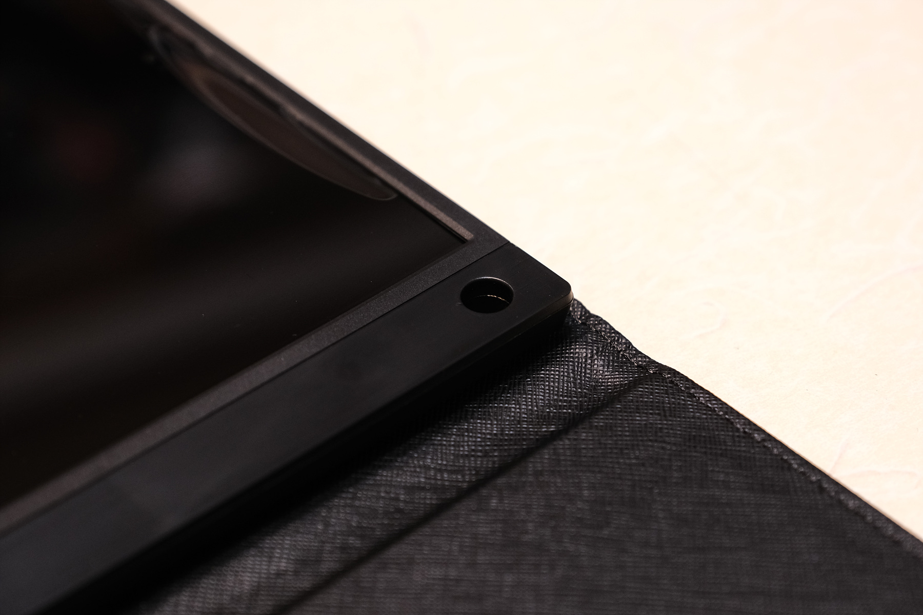 오른쪽에는 구멍이 하나 있는데 이것은 분리가 가능한 패브릭케이스를 쓰지 않을 떄 여기에 펜 같은 것을 놓고 모니터를 세울 수도 있습니다.