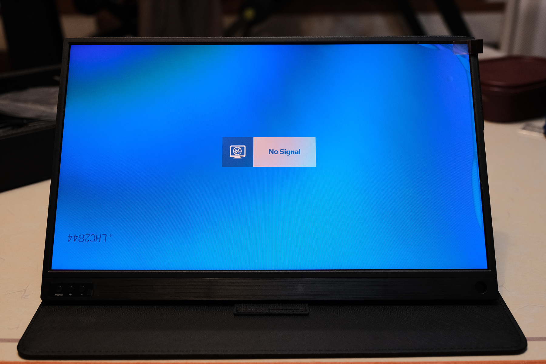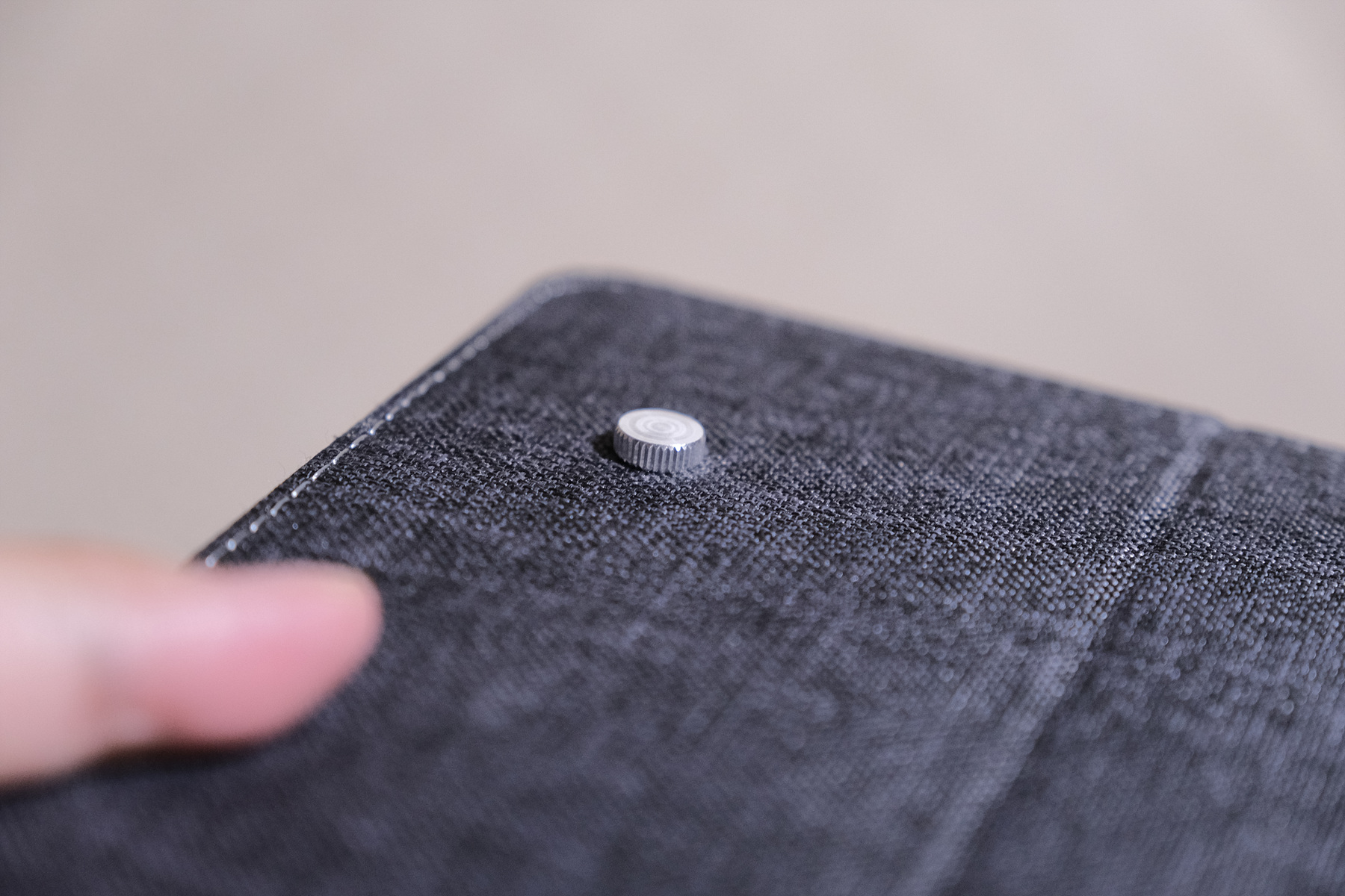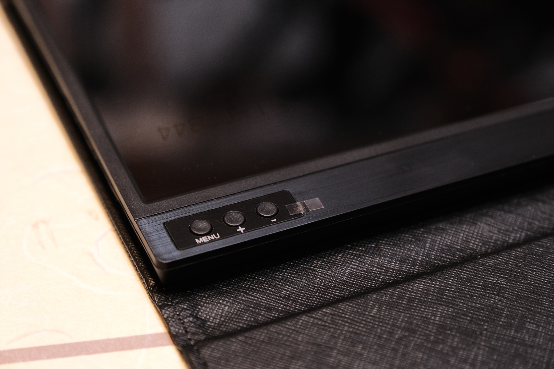페브릭 케이스 하단부에는 모니터의 각도를 3단으로 조절할 수 있는 턱이 있습니다. 같은 패브릭 재질이라 디스플레이에 흠집을 줄 일도 없어서 좋습니다.