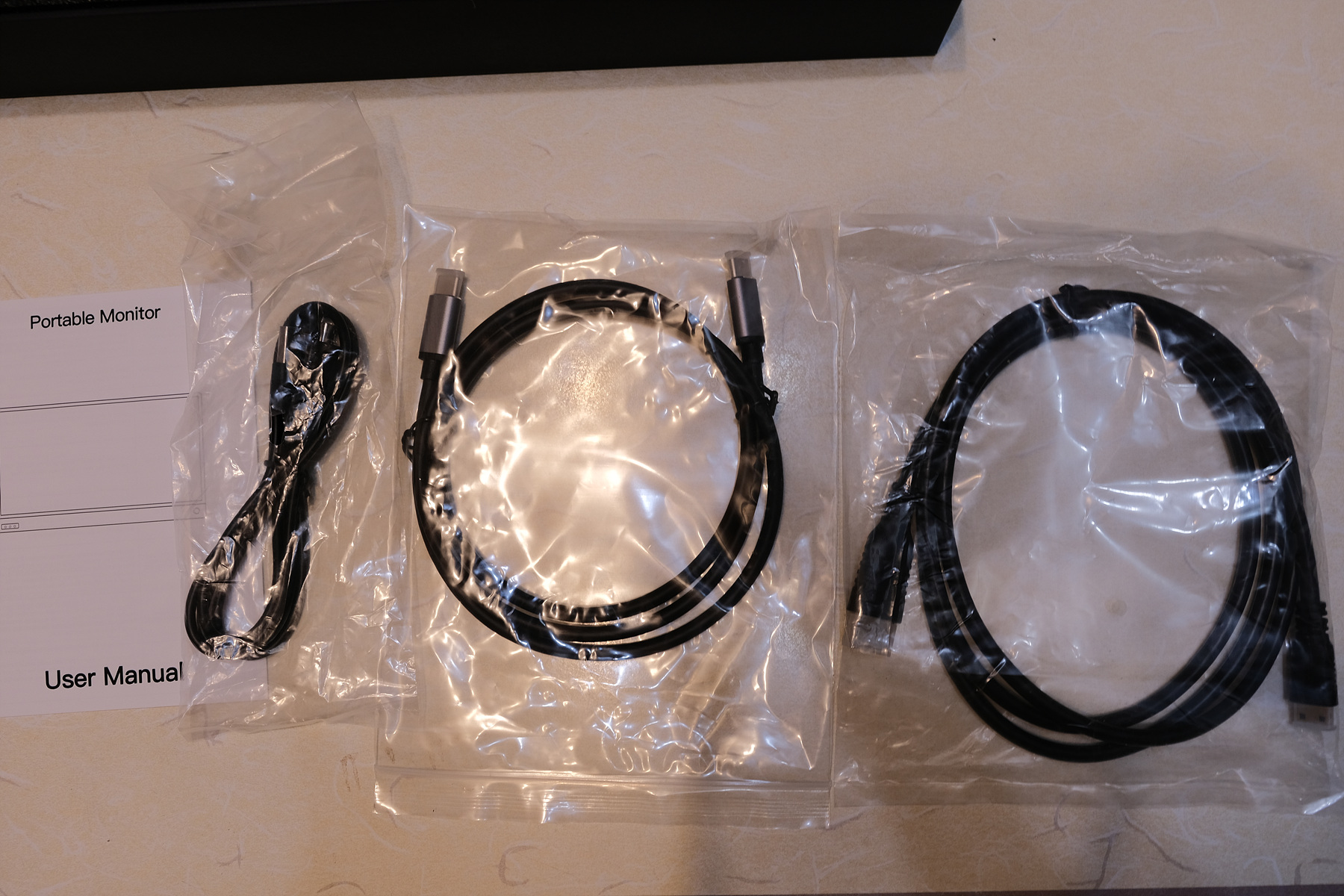 모니터 외에 구성품은 3개의 케이블과 설명서입니다.