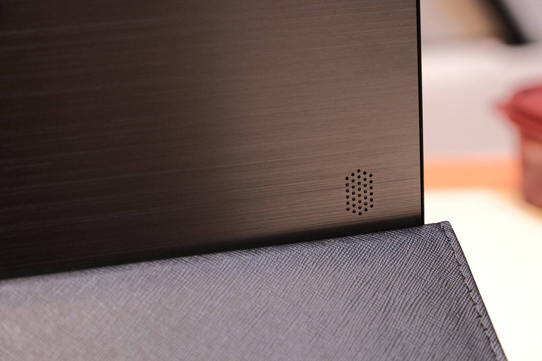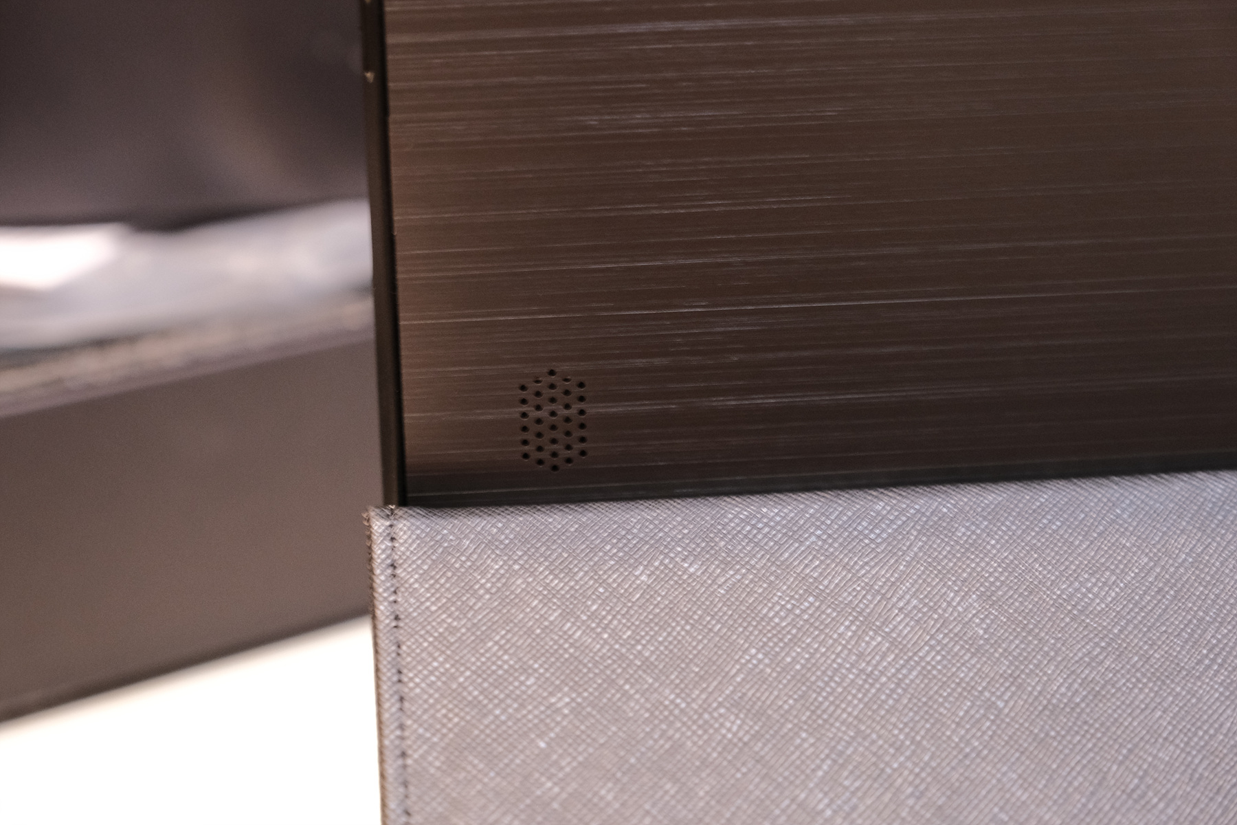 왼쪽 스피커입니다. 전체적인 마감은 헤어라인 마감인 것을 볼 수 있습니다.