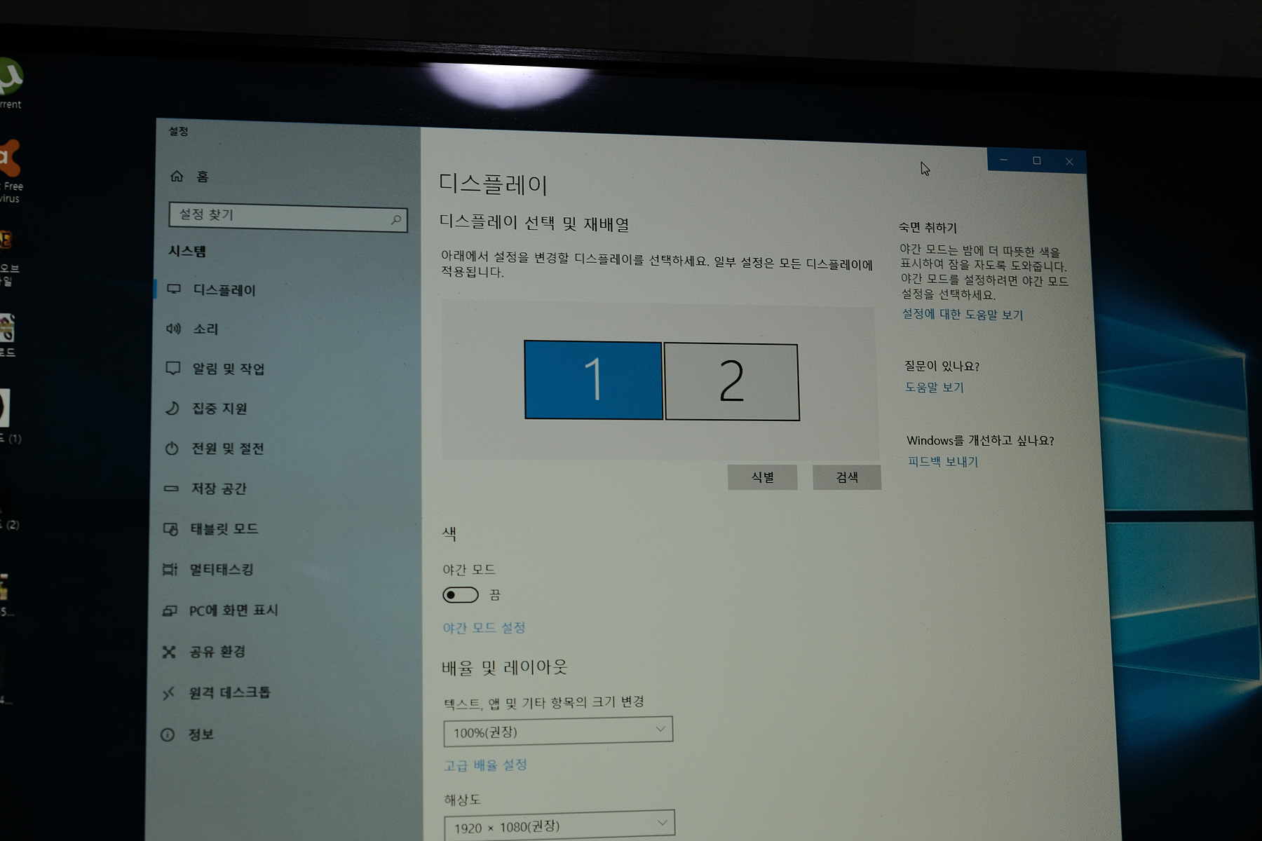 미니PC를 연결 하고 전원을 켠 다음 두개의 모니터를 각각 인식하도록 했습니다.