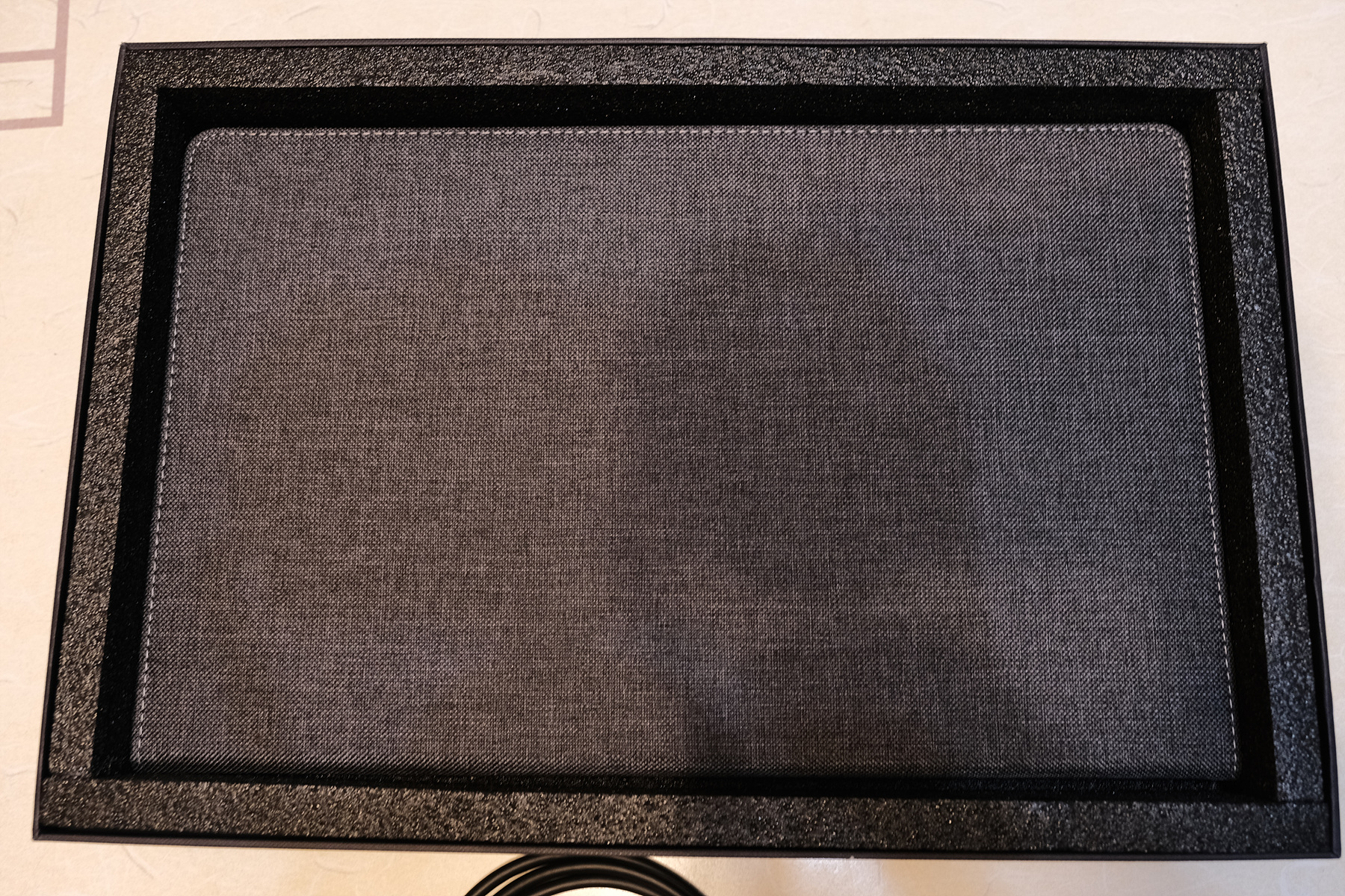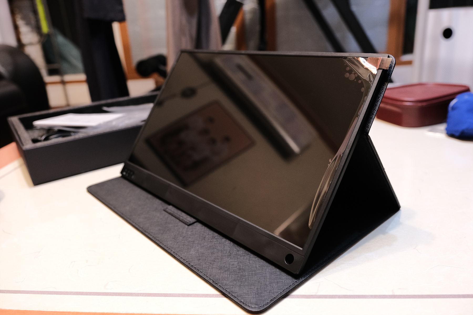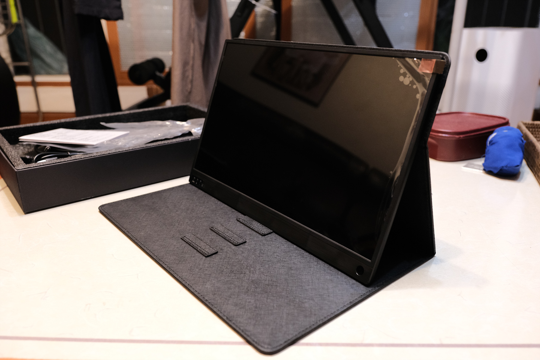 자 이제 모니터를 보겠습니다. 모니터는 패브릭 케이스로 감싸져 있습니다.