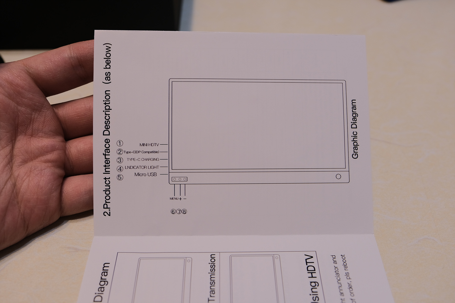 모니터의 각 버튼 설명서가 나와있습니다. mini HDMI포트는 1개이고 C타입 포트는 2개, 그리고 5핀 마이크로USB 포트는 1개입니다.