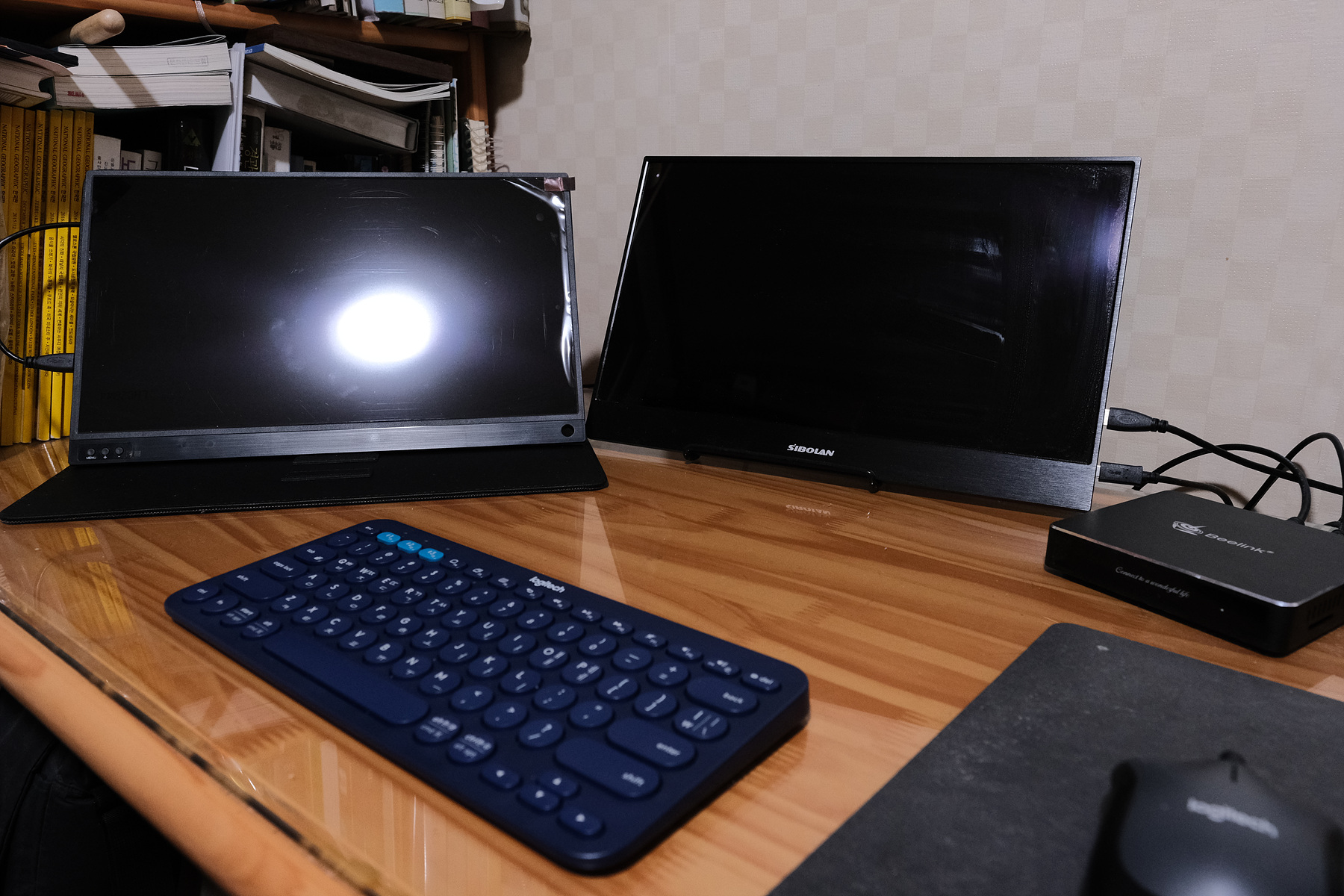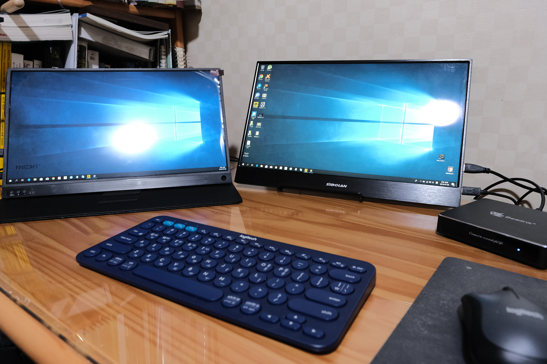 미니PC와 블루투스 키보드, 그리고 두개의 포터블 모니터로 공간 활용에도 매우 좋습니다.