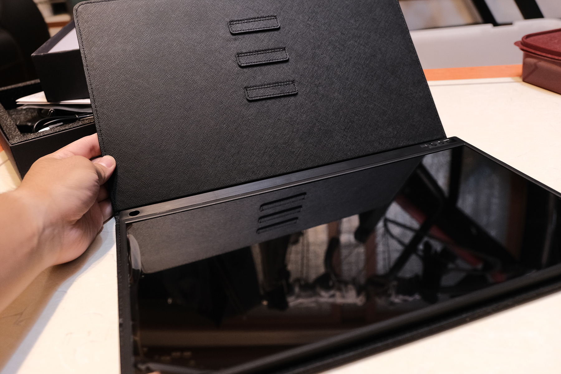 조절이 가능한 나사로 조여져 있습니다. 이걸 돌려서 풀면 케이스와 모니터가 분리가 됩니다. 분리하여 모니터를 따로 파우치에 넣고 다닐 수도 있습니다.