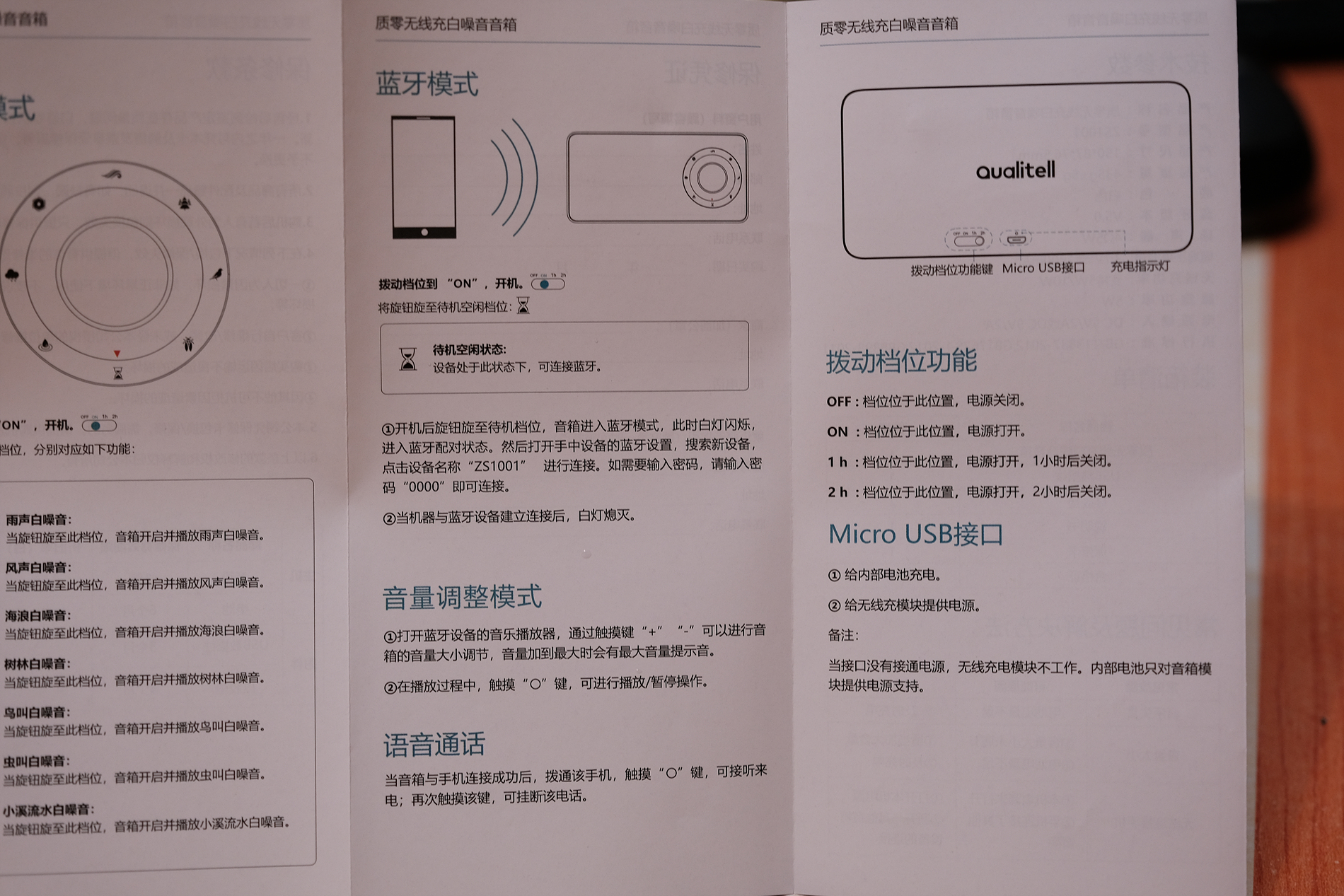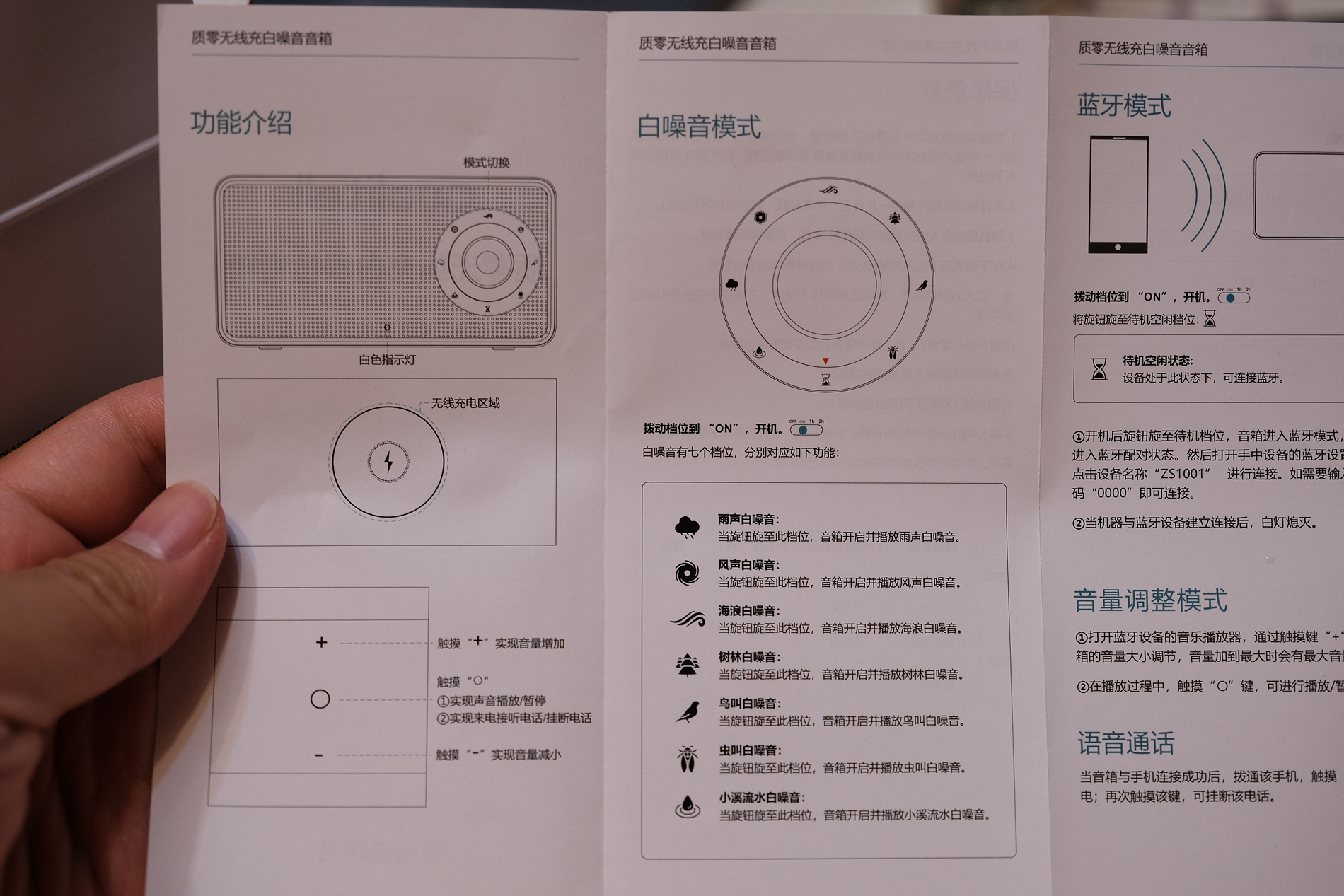 설명서에는 그림만 봐도 알만한 내용들이 있습니다. 무선충전, 7가지 자연의 소리 및 볼륨조절 등이 있습니다.