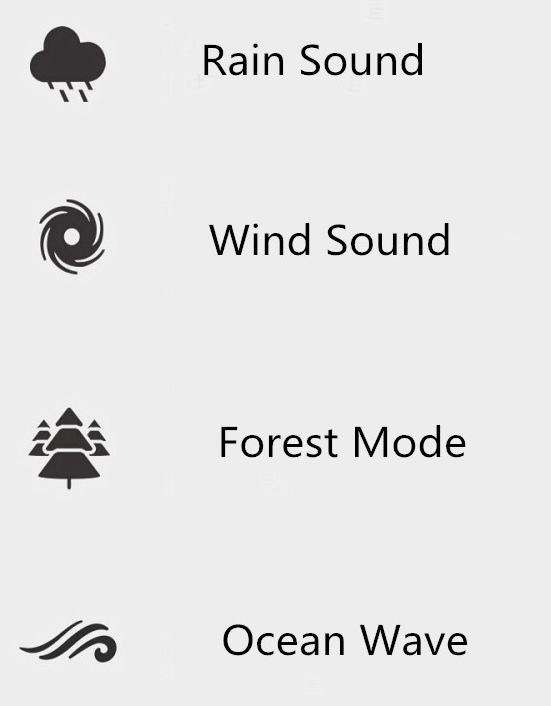 기본적으로 들어가 있는 7가지의 자연의 소리입니다. 픽토그램으로 되어 있어서 직관적으로 어떤 소리인지 알 수 있습니다. 빗소리, 바람소리, 숲소리, 파도소리, 새소리, 귀뚜라미소리, 물소리로 되어 있습니다. 직접 들어보고 사용하였는데 저는 빗소리를 너무 좋아해서 빗소리에 잠을 잘 잘 수 있었습니다.