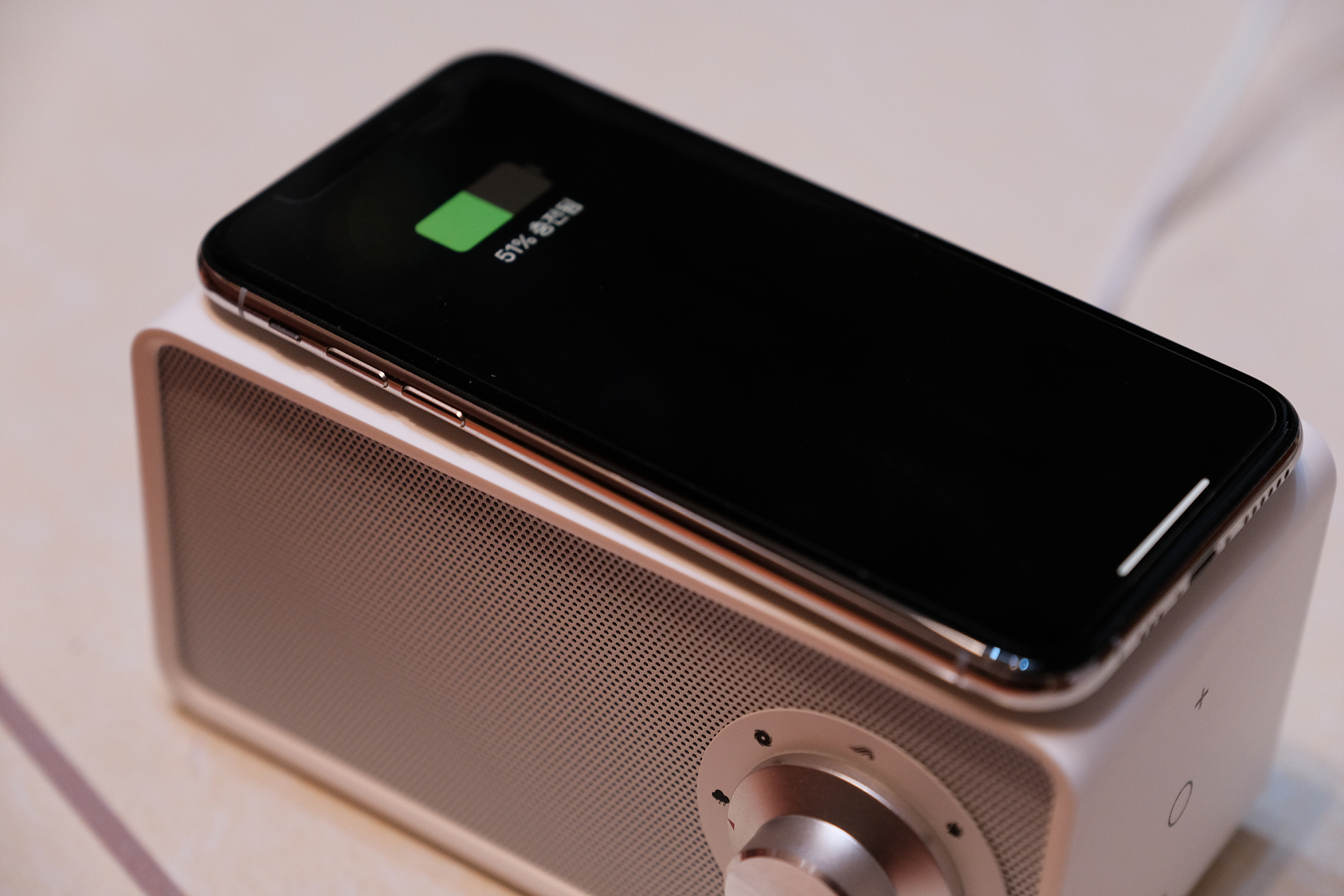 제 아이폰을 충전시키고 있는 모습입니다. 자기전 수면 사운드를 켜놓고 스마트폰을 충전시키고 자면 정말 유용합니다.