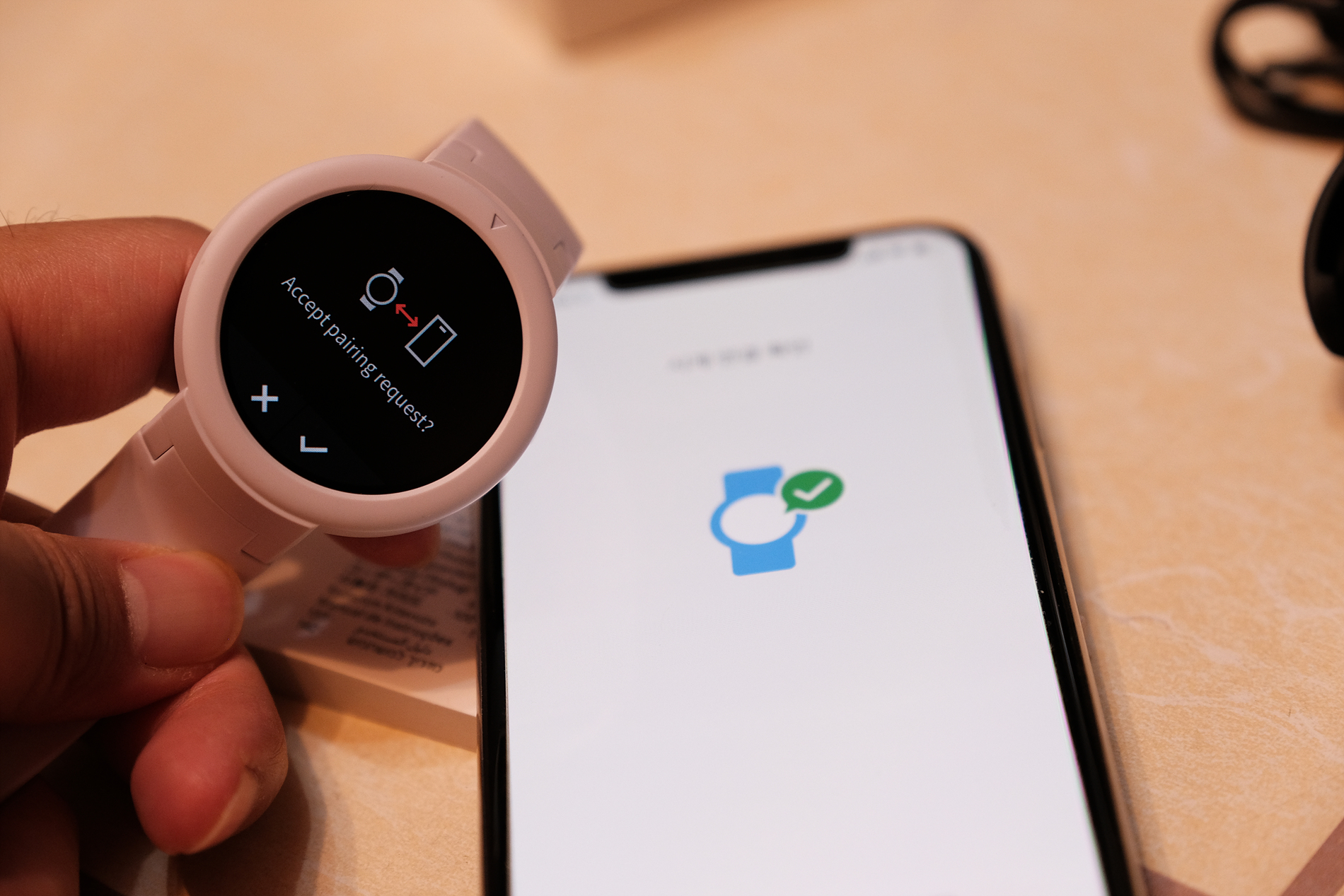 페어링 직전에 시계에서 한번 더 페어링을 확인합니다. 손가락으로 V표시를 선택하면 연결이 완료됩니다.