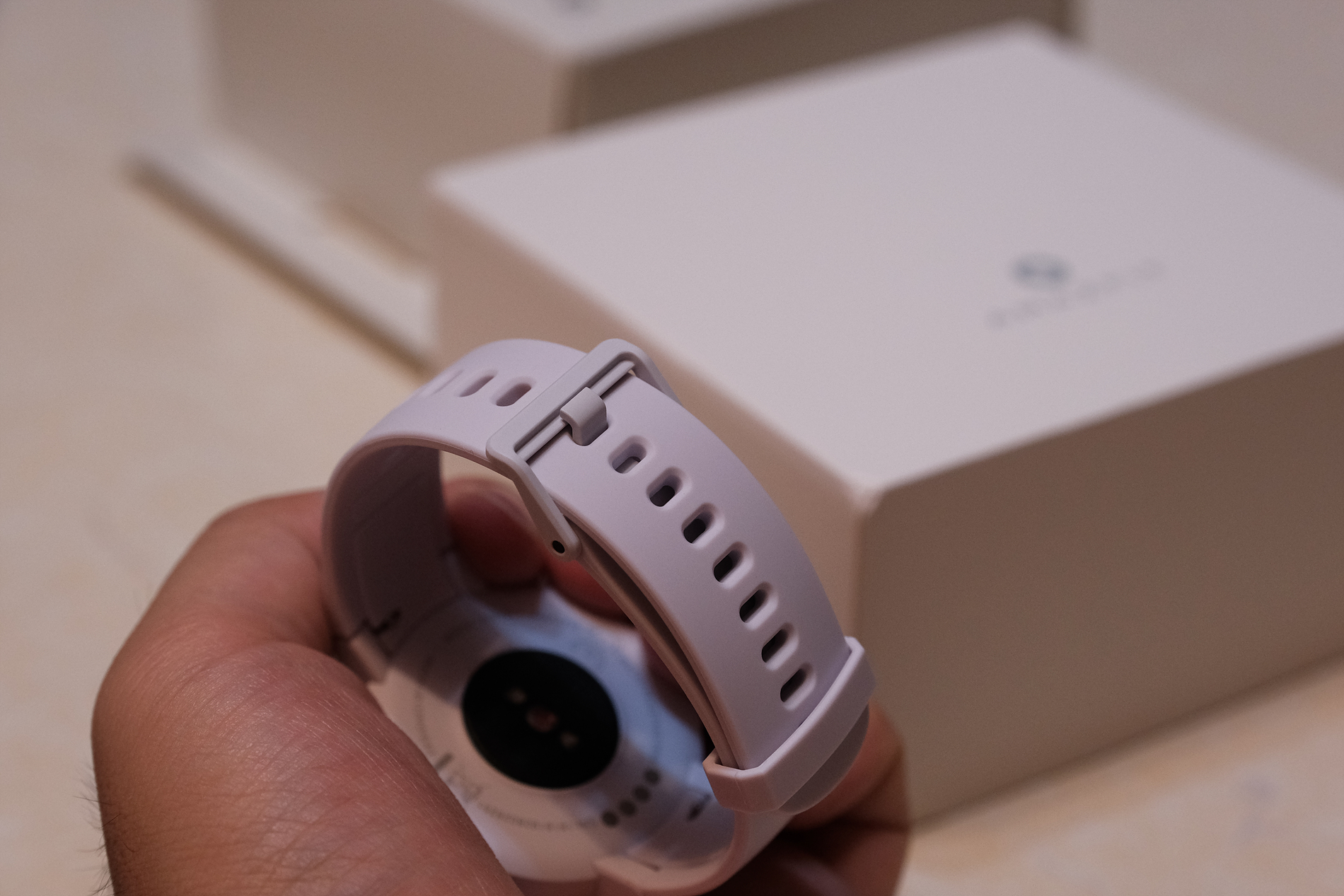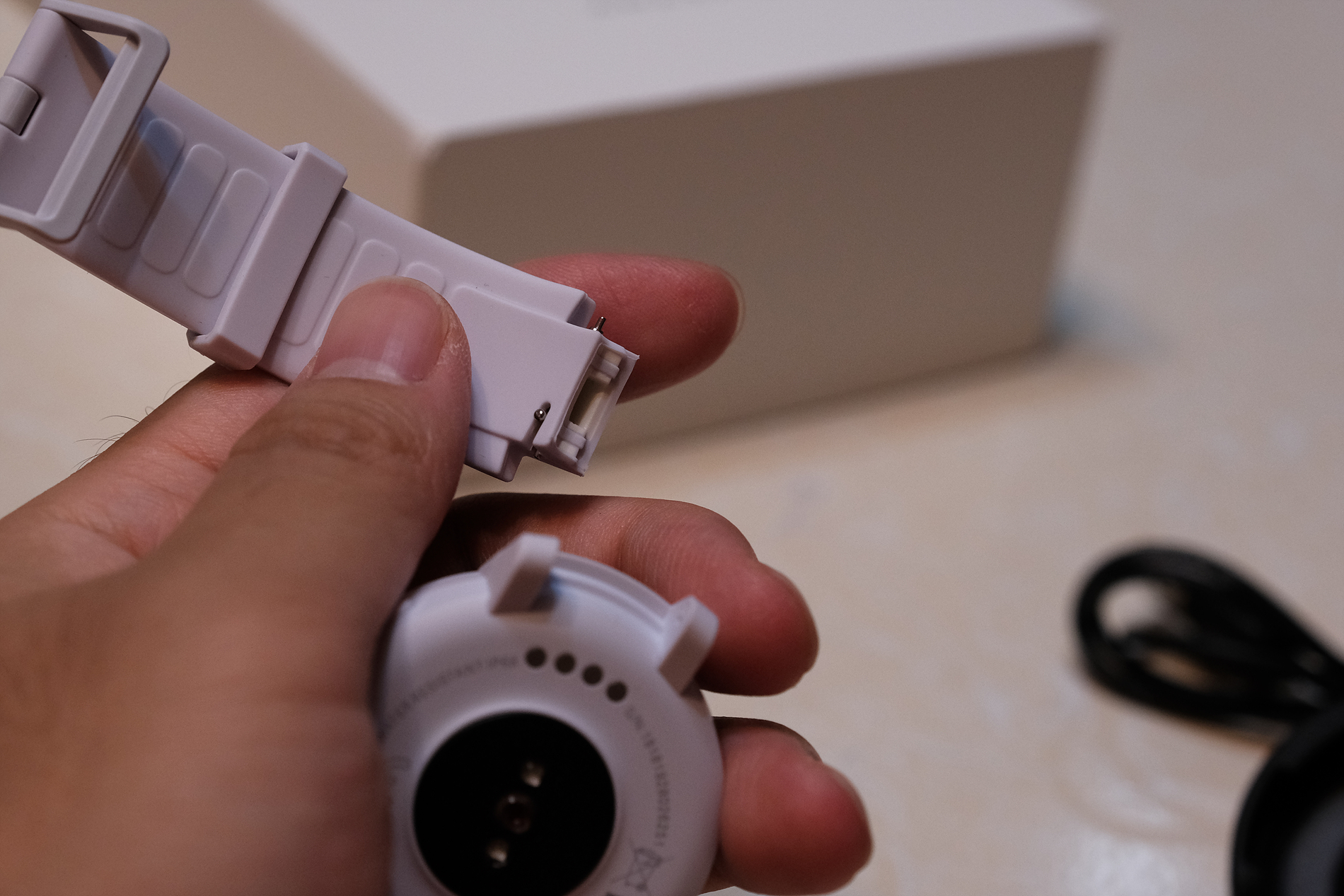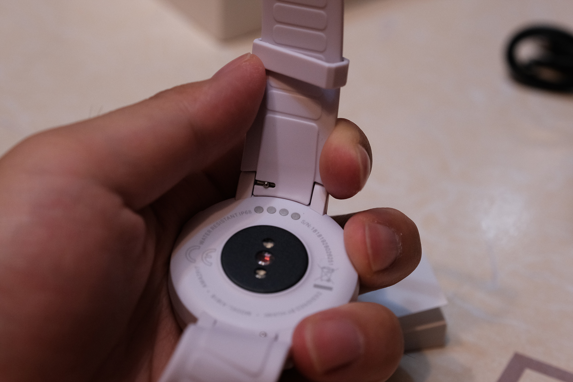 이제 스마트워치에 대해 보겠습니다. 먼저 기본 탑재된 스트랩부터 보겠습니다. 색상은 흰색이며, 매우 말랑말랑한 재질입니다.