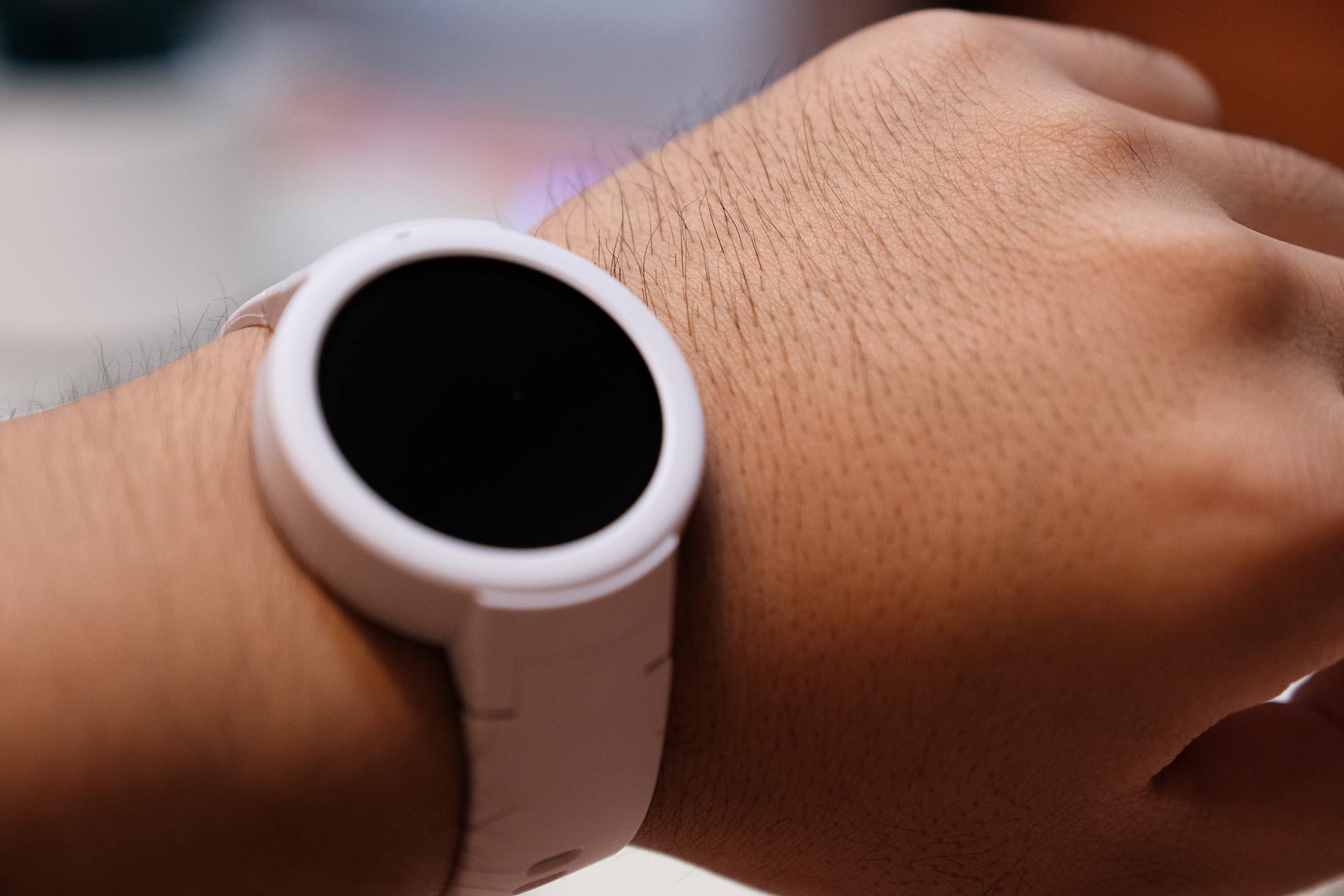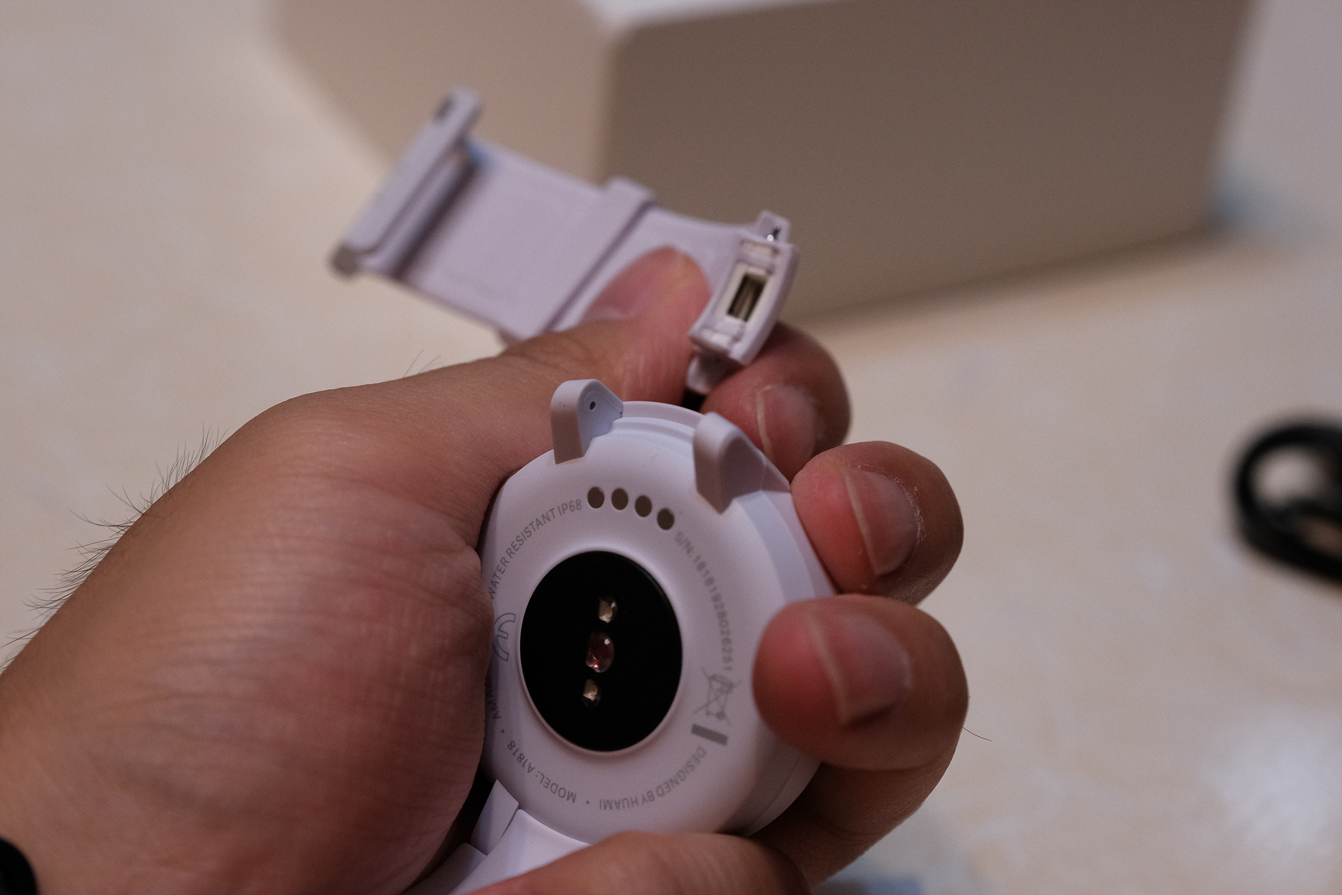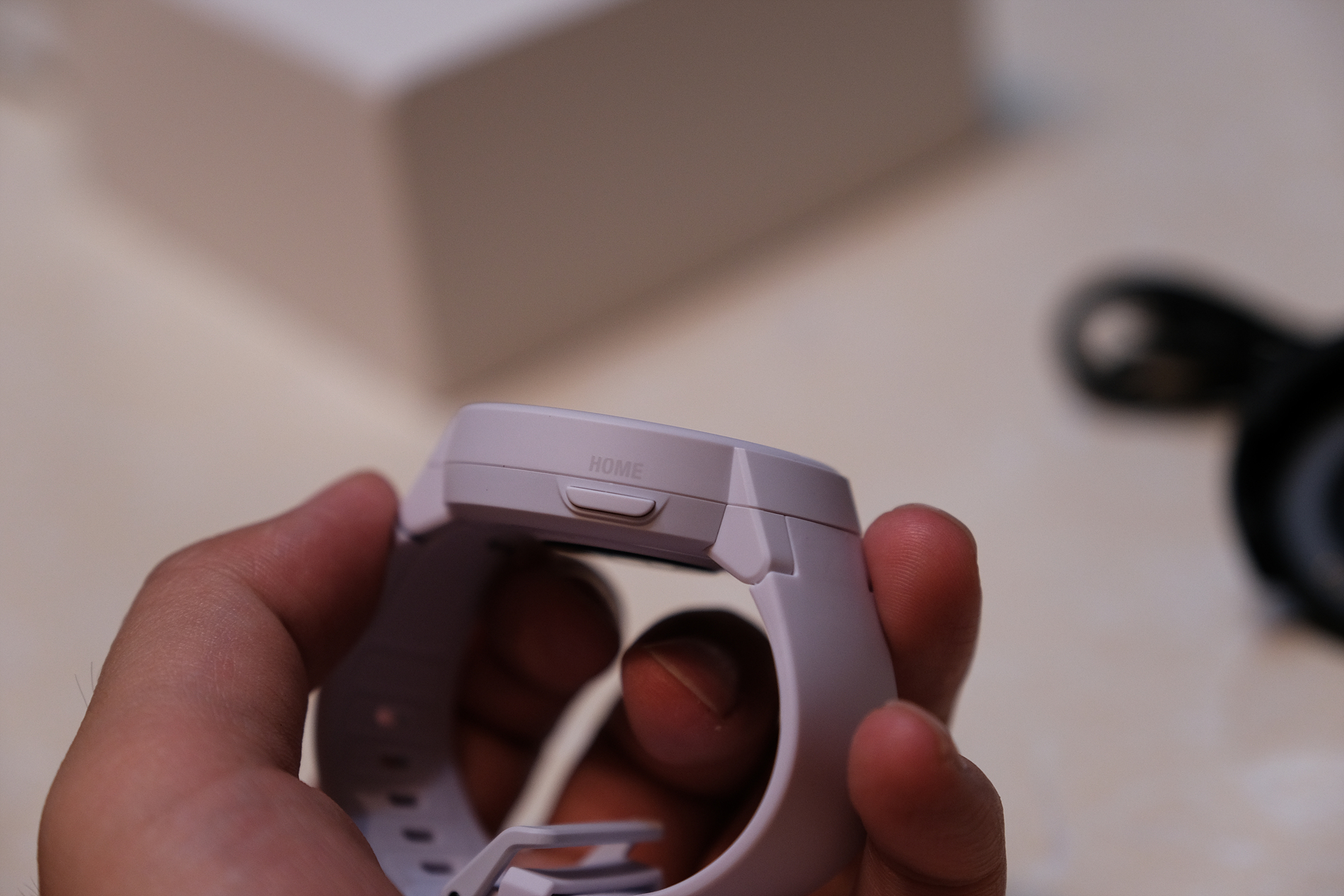 이제 스마트워치에 대해 보겠습니다. 먼저 기본 탑재된 스트랩부터 보겠습니다. 색상은 흰색이며, 매우 말랑말랑한 재질입니다.