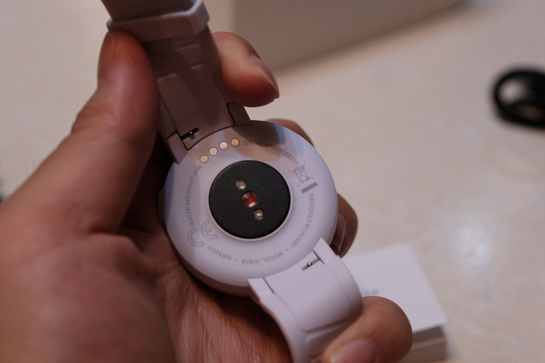 뒷면에는 심박수센서가 중앙에 있고 가장자리에는 충전단자가 보입니다.