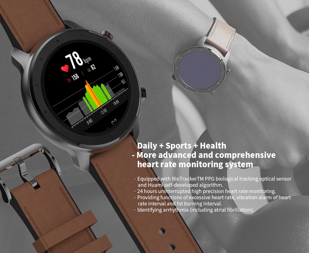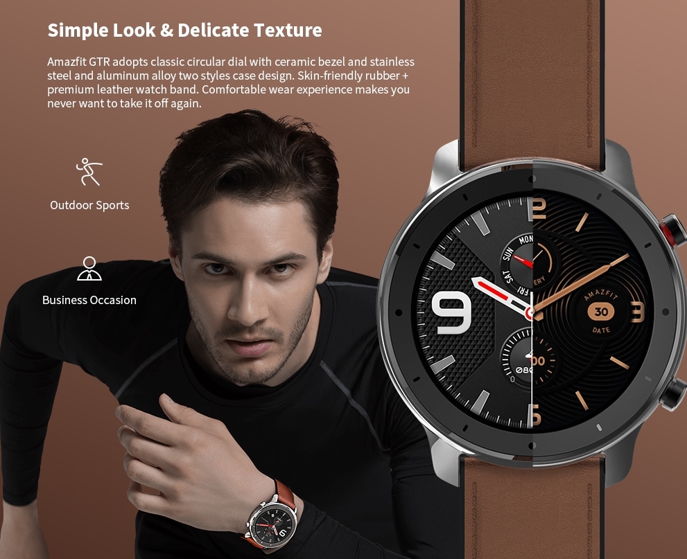 어메이즈핏 GTR 스마트워치는 크기도 크지만 베젤이 매우 얇아 이질감도 없으며 큰화면에 디스플레이를 전부 해주기 때문에 어색하지 않습니다. 또한 피부에 잘 맞는 고무재질과 가죽 스트랩이 사용자경험을 더욱 편안하게 제공하도록 돕습니다.