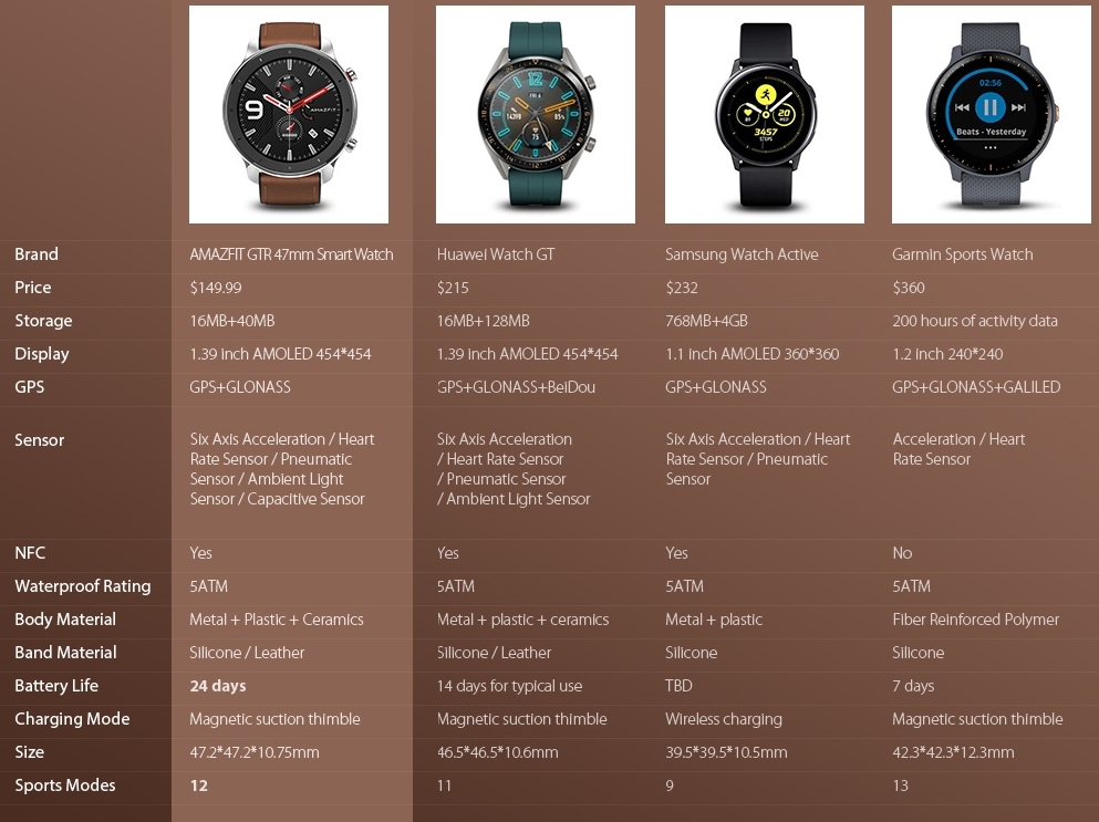 어메이즈핏 GTR 스마트워치와 화웨이 GT스마트워치, 삼성 액티브 스마트워치, 가민스포츠 워치와 비교해보았을 때, 가격적으로나 스펙으로도 매우 뛰어남을 알 수 있습니다.